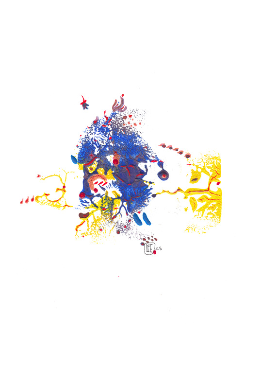 Mon travail d’encre sur papier propose une lecture d’un crabe dont la carapace est en train de se dissoudre. J’aime travailler avec l’encre dans une démarche de spontanéité et de libre interprétation sur la forme qui apparait. Je dévoile ma lecture en apposant et superposant des détails de couleurs pour partager mon ressenti.